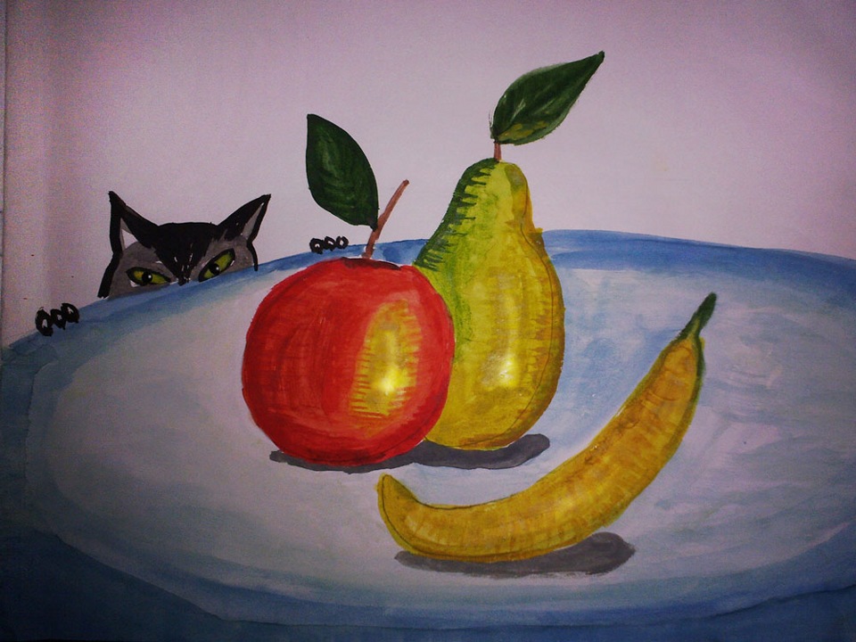 В этой работе автор обращается к такому жанру изобразительного искусства как натюрморт. Мастера натюрморта на протяжении всего времени стремятся передать в своих работах многообразие мира, в котором каждое создание, будь то и неодушевленный предмет, обладает неповторимыми свойствами, достойными быть запечатленными на холсте.Данный натюрморт выполнен в ярких насыщенных красках. Изумленный зритель может ограничиться впечатлением от созерцания изображений: любоваться мастерством живописца, яркостью красок, особенностями передачи фактуры. Действительно, изображенные предметы выглядят очень правдо]подобно и словно дублируют реаль]ность, создают живой объем на плос]кости.Искушенный же зритель увидит в изображенных элементах важное скрытое значение, каждая вещь здесь имеет тайный подтекст, указывая на человеческие добродетели и грехи. Так, лицо кота, в глазах которого мы читаем желание наложить лапу на спелые фрукты означает угрозу плодородию среднерусской равнины, луч света, бликующий на боках фруктов несет в себе скрытый смысл таинства причастия!Сексуально же настроенные зрители могут усмотреть в кошке напоминание о плотских утехах, банан, расположенный под углом в 45 град к основной композиции укрепит их предположение.Одним словом, эстетическая ценность данного натюрморта бесспорна, значение его многогранно, за что и скажем спасибо автору, т.е. мне!